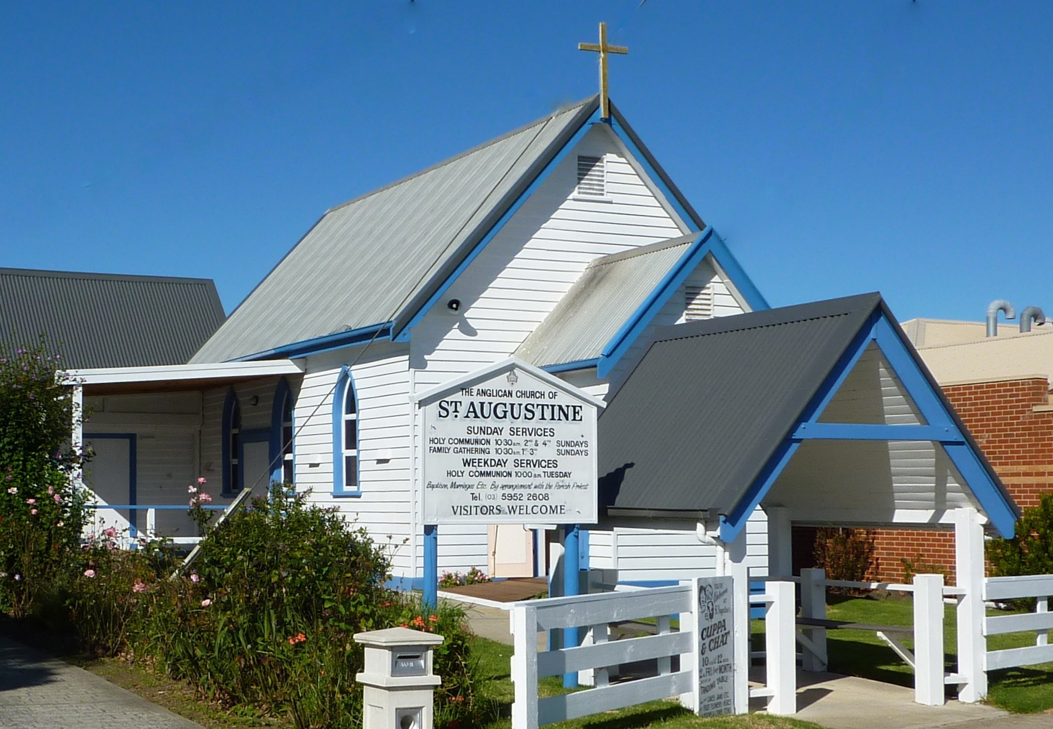 The earliest Church of England ministry in San Remo was carried on under the auspices of the Gippsland Forest Mission, founded in 1879 under the supervision of the Rev’d Samuel Sandiford, based in Drouin. Much of this ministry was provided by his curate, the Rev’d Herbert Potter, and services were held in the Shire Hall. On 4 March 1906, the newly-built St Augustine’s Church was dedicated by the first Bishop of Gippsland, the Right Rev’d Arthur Pain. In 1931 the distinctive Lych Gate was added, and the general-purpose Mary Talbot Room, behind the church, in 2012.